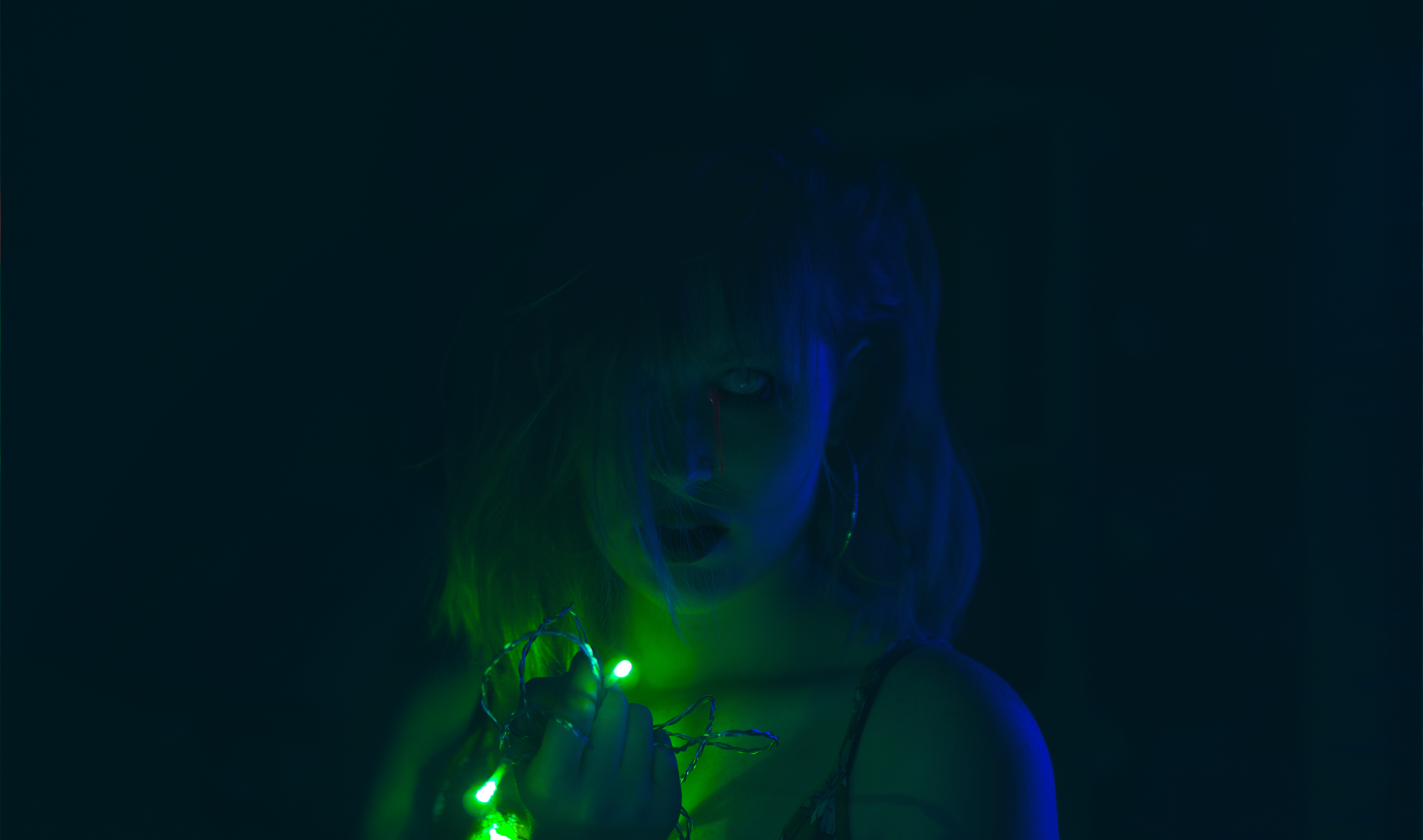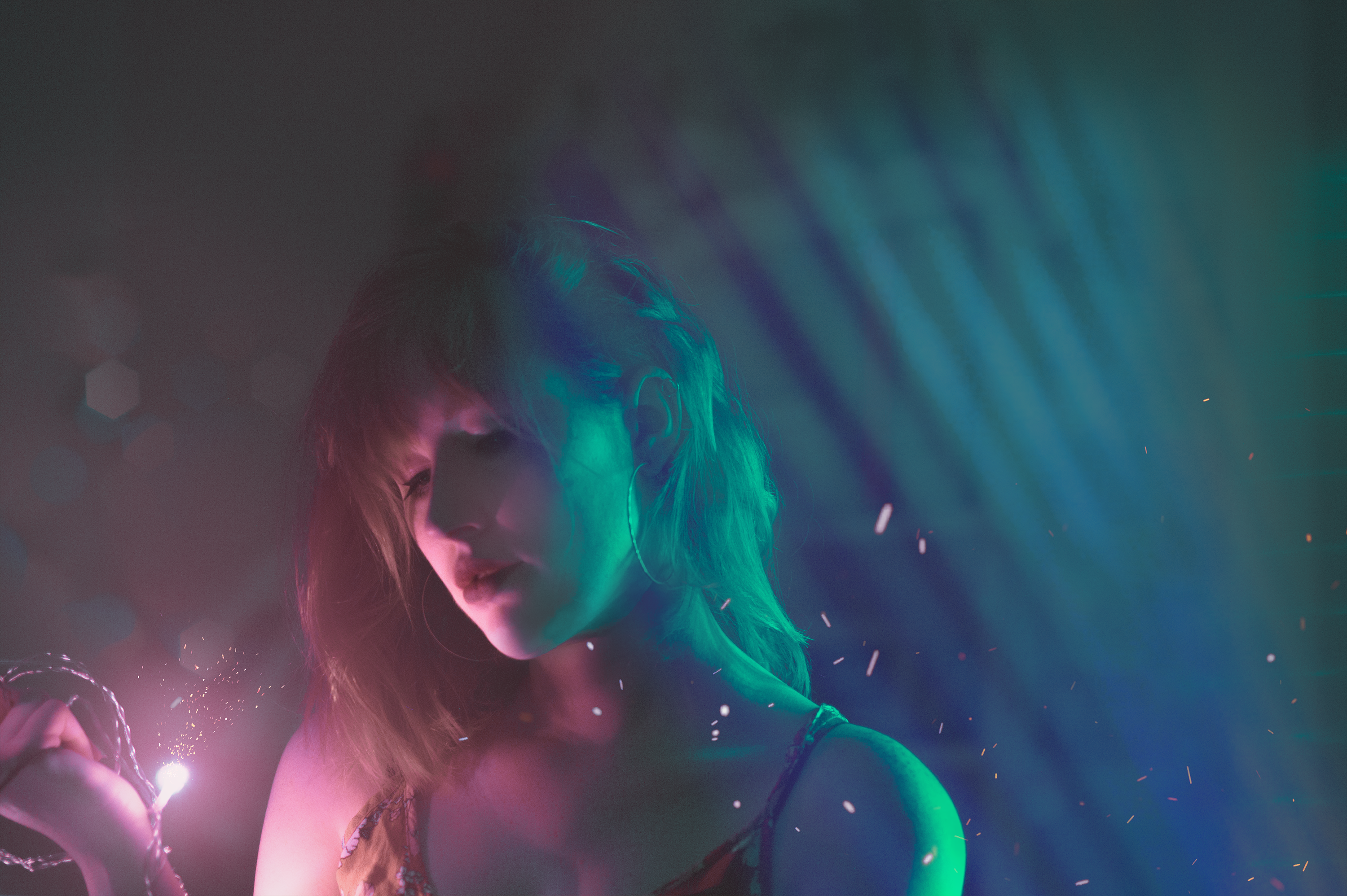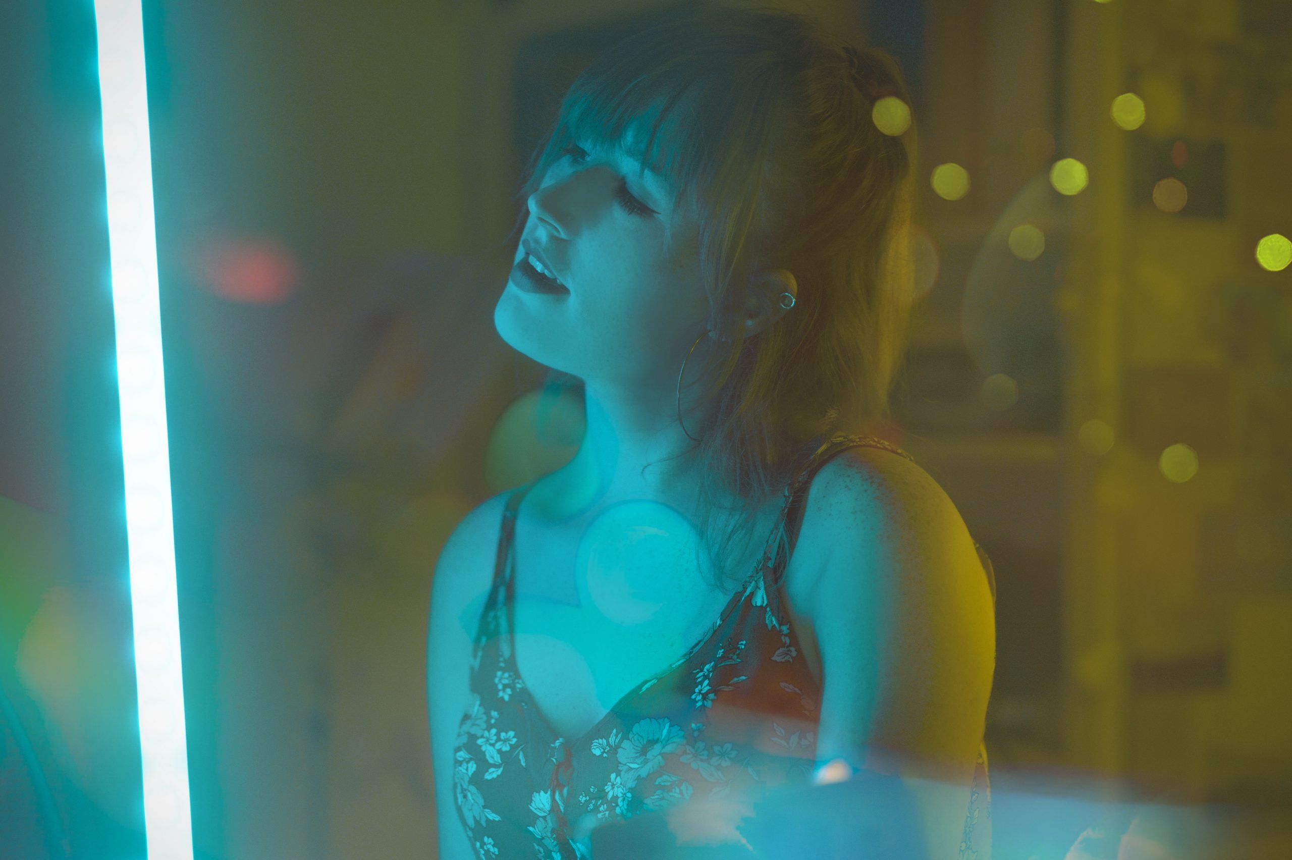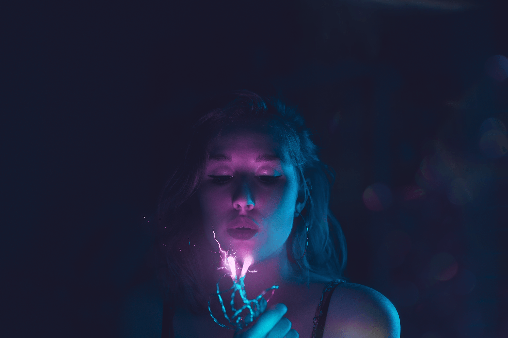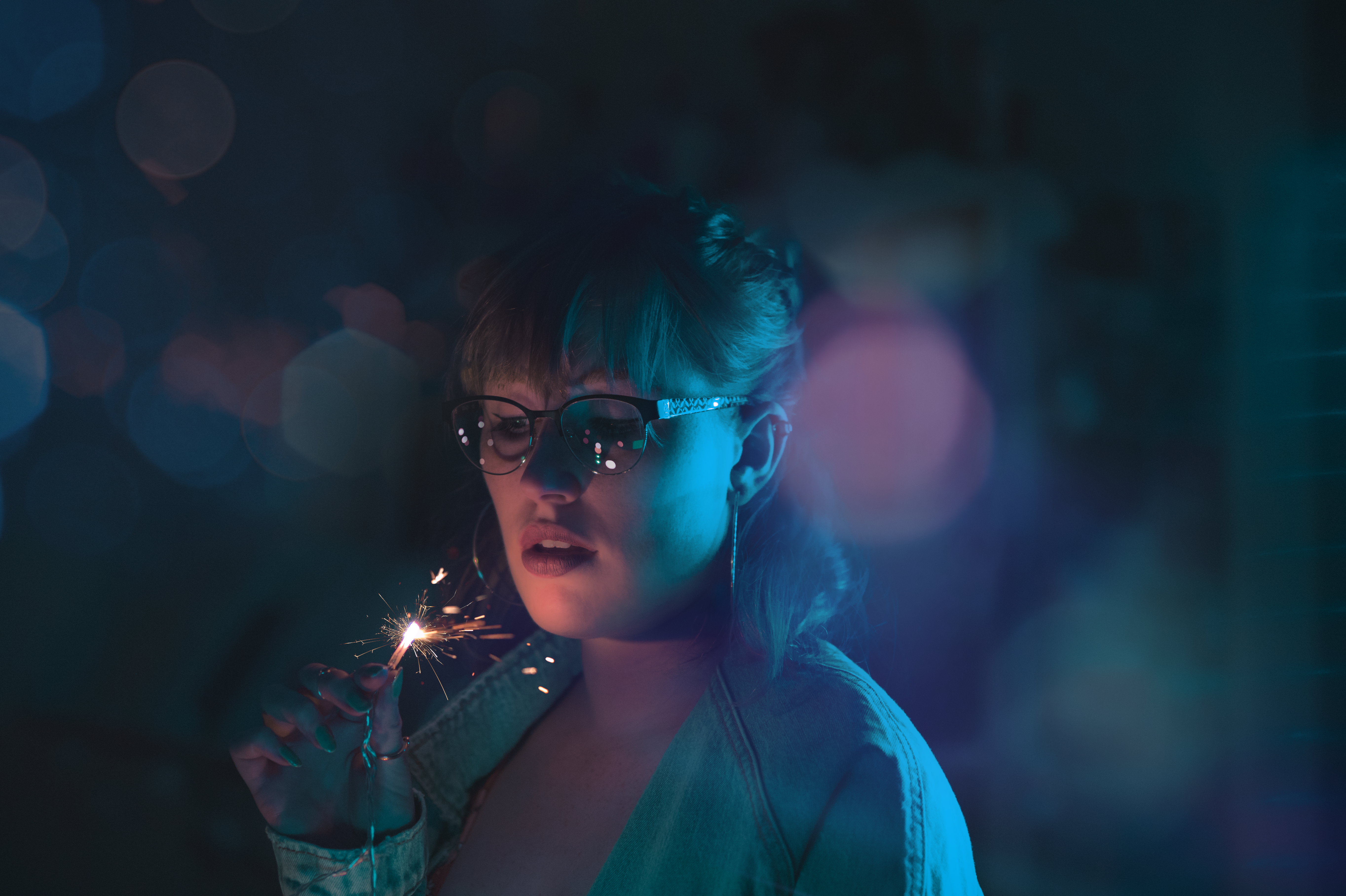 In this self-portrait photography series, I explored the interplay of colors and lighting to create visually captivating images. The primary color palette included blue, turquoise, purple, and pink, chosen for their vibrant and dynamic qualities. These hues were enhanced through the use of the bokeh effect, adding a dreamy, blurred background that accentuated the subject.