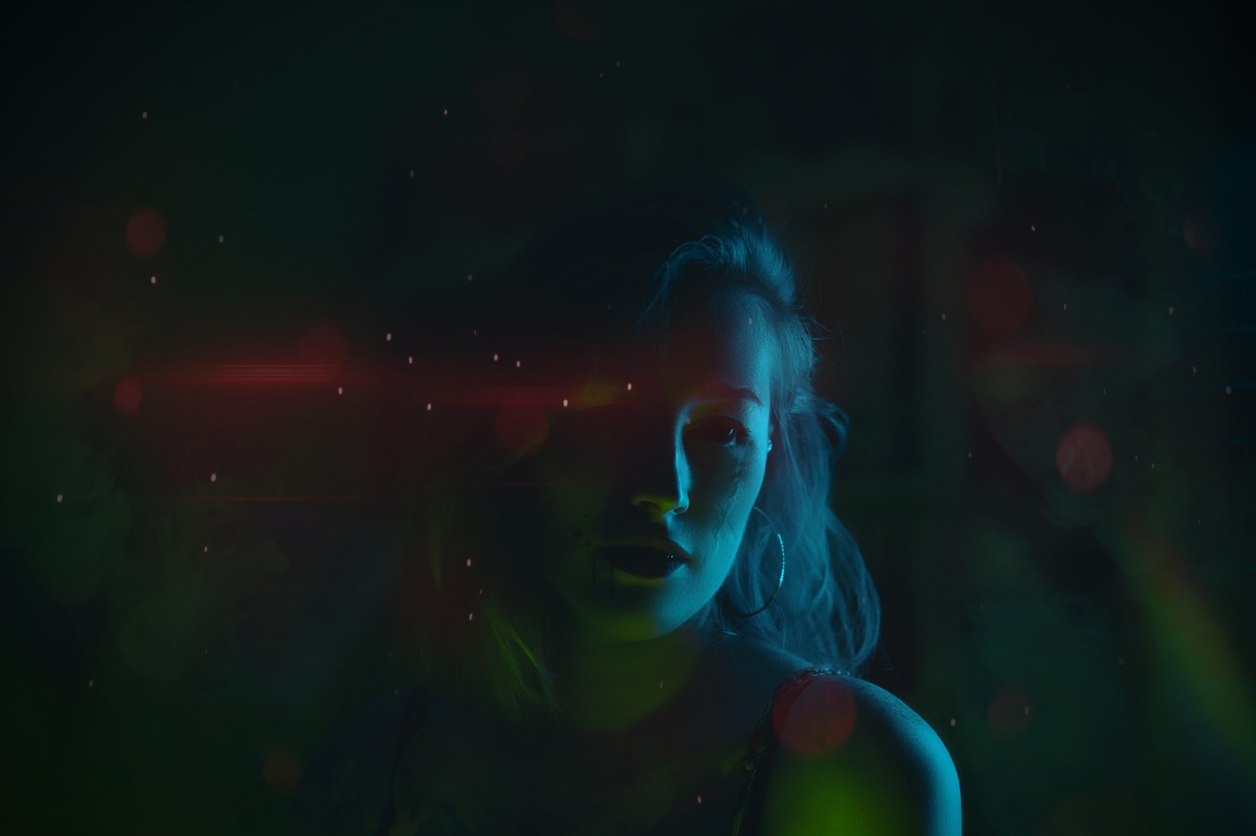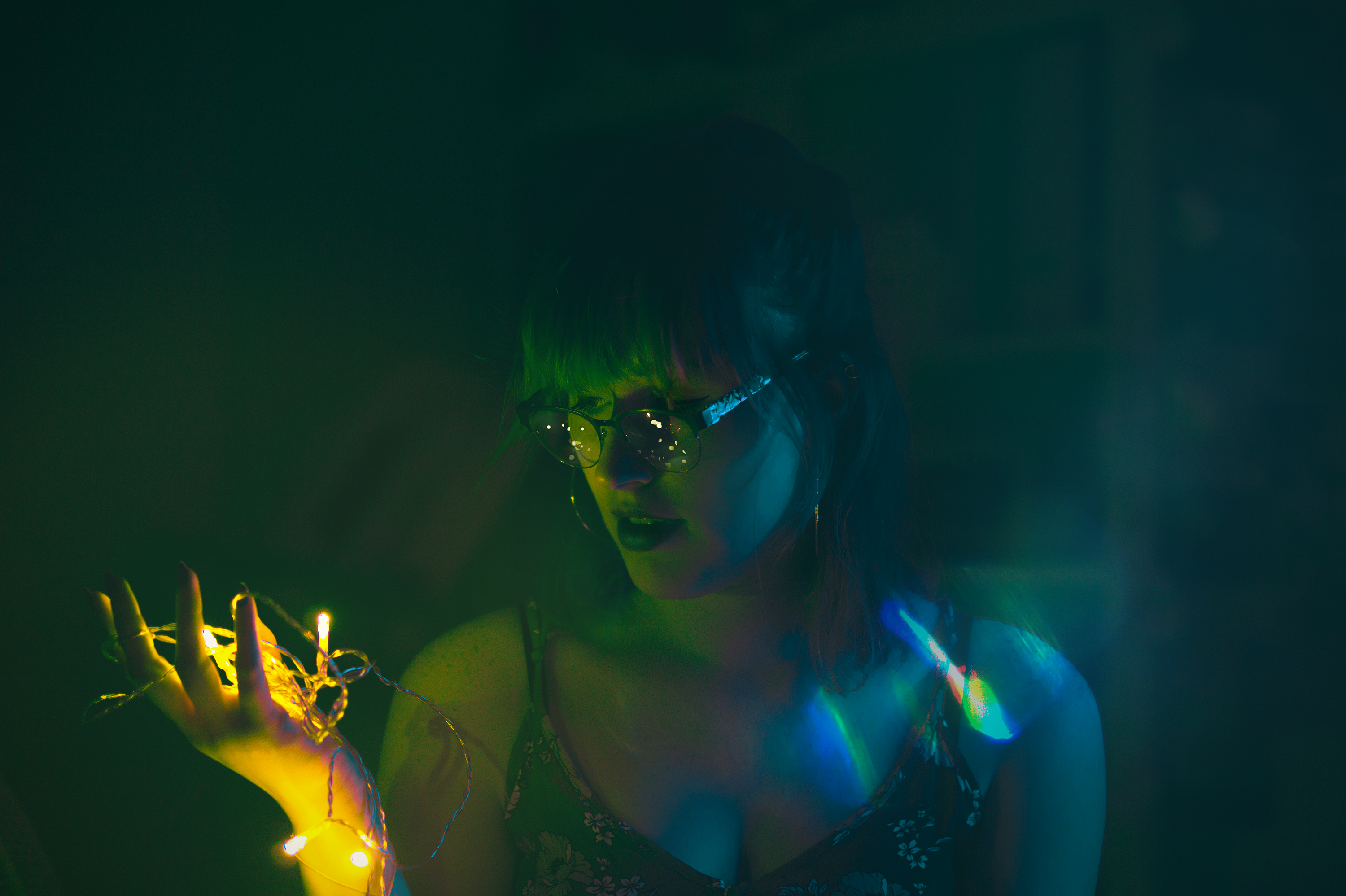 To achieve a unique aesthetic, I incorporated unnatural lighting effects, experimenting with various light sources and angles to create striking contrasts and highlights. The emphasis on maintaining pure skin tones added a touch of realism amidst the surreal lighting and colors. A notable feature of this series is the use of reflection effects, particularly in glasses, which added an extra layer of depth and complexity to the images. These reflections played with the surrounding colors and light, creating interesting visual echoes. Self-portraiture posed significant challenges, as it required meticulous attention to light setup, camera composition, clipping, detailing, and posing—all done solo. This self-staging aspect added a layer of difficulty but also allowed for complete creative control and personal expression.